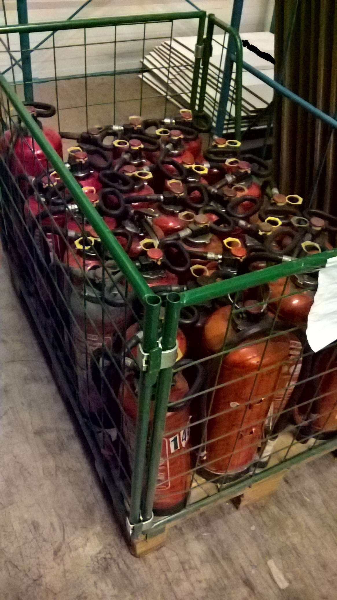 Heute hat mir ein Bekannter ein Bild mit Feuerlöscher in eine Gitterbox geschickt. Er fragte mich ob das erlaubt wäre die mit dem Fuhrpark der Firma zum Kunden zu befördern? Die Schaum-Feuerlöscher waren zu Wartung und zu befüllen. Jetzt sollen die wieder zurück zu Kunden.