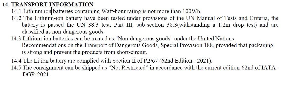 Ich hab mal was angehängt - die Angaben sind höchst missverständlich und für Laien nicht zu beurteilen. z. B. diese Aussagen, dass Batterien nur >100 Wh Gefahrgut wären. dann wirft man regelmäßig mit allerlei (gern veralteten) Vorschriften um sich, damit man den Abschnitt 14 irgendwie füllt. Die blauen Kommentare in dem einen Beispiel sind von mir.
