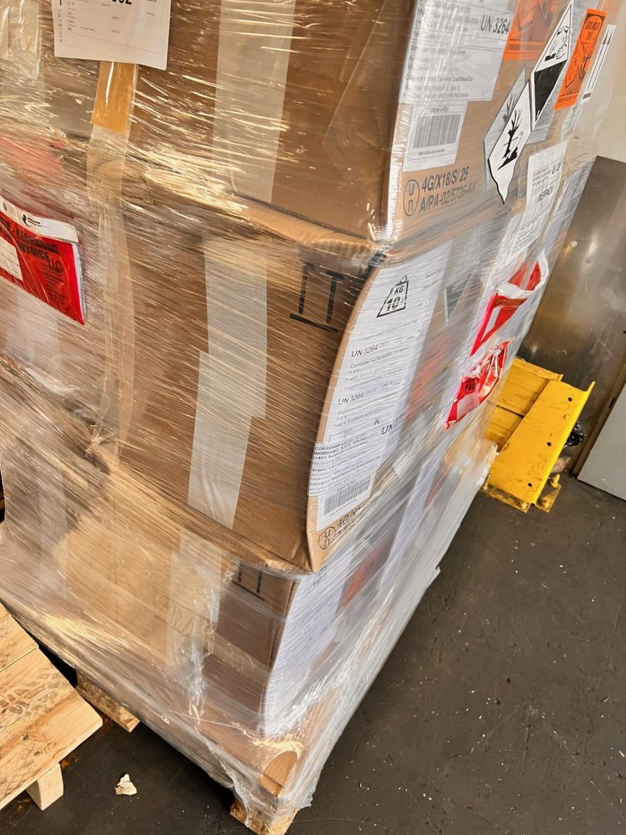Die Ware kommt aus den USA per Luftfracht zu uns – in einem Overpack, bei dem man aufgrund der verwendeten Folie mögliche Schäden nicht direkt erkennen kann.