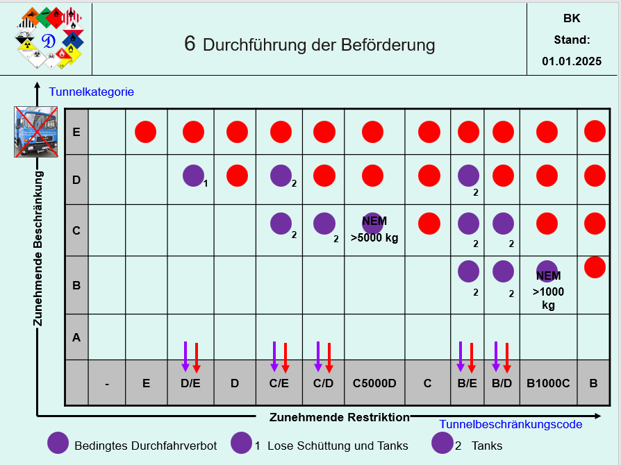 Bei kombinierten Tunnelbeschränkungscode gilt der erste Buchstabe wie D/E; C/E; C/D; B/E; B/D gelten für die Tankbeförderung.